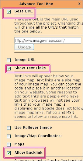 4. Coloque o código das imagens com links na área onde vai o HTML para ser o seu Menu (faça isso na área de postagem para ficar melhor para pegar o código), ou então o código de sua C-box, ou dos seguidores (que vc obtém no Google Friend Connect - www.google.com/friendconnect). Uma opção mais rápida, caso queira fazer um Menu, é vc criar uma imagem com os títulos de tudo aquilo que deseja linkar e depois mapear a imagem, ou seja, colocar links automaticamente na própria imagem. Isso pode ser feito em um site chamado Image Map Tool, assim: