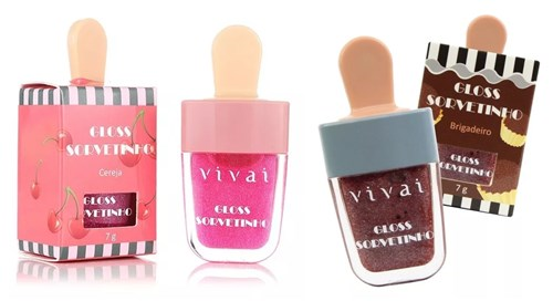 O Lip Gloss Ice Cream da Vivai é descrito como um produto com 'cheirinho ótimo e do formato incrível de sorvetinho, tem excelente fixação e pigmentação; são 6 cores'.